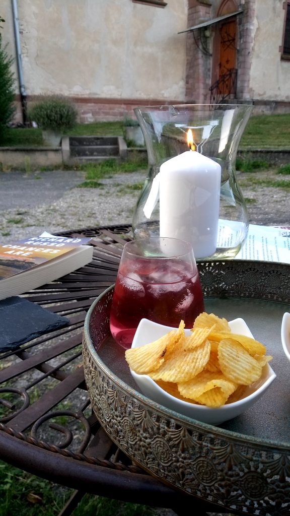Three and a half hours later, my carnal needs awaken. Apéro, drink, snacks…time to shift bases. Everything installed. Rosato, ice cubes, water. …. Spanish ham flavoured crisps.